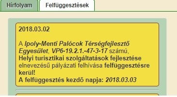 Az Ipoly-menti Palócok Térségfejlesztő Egyesülete munkaszervezete ezúton tájékoztatja az érintetteket, hogy a VP6-19.2.1.-47-3-17 kódú, Helyi turisztikai szolgáltatások fejlesztése című felhívás felfüggesztésre került forráskimerülés miatt. Pályázat benyújtás felfüggesztés időpontja 2018. március 3. A pályázat benyújtása 2018. március 2. 23:59-ig lehetséges