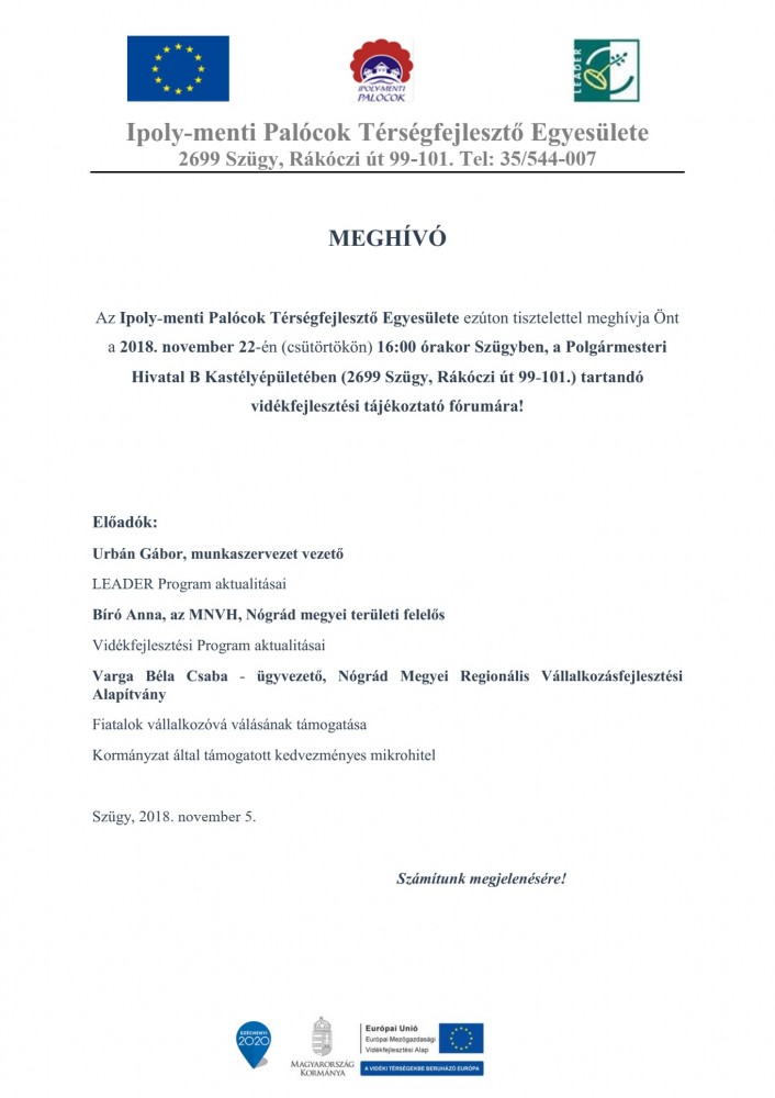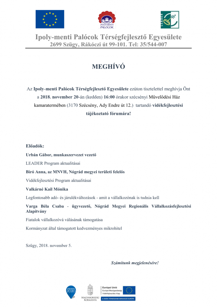 Az Ipoly-menti Palócok Térségfejlesztő Egyesülete ezúton tisztelettel meghívja Önt a 2018. november 20-án (kedden) és 2018. november 22-én (csütörtökön) 16:00 órakor Szécsénybe és Szügybe tartandó vidékfejlesztési tájékoztató fórumára!