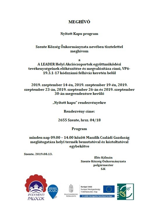 MEGHÍVÓ Nyitott Kapu program Szente Község Önkormányzata szervezésében