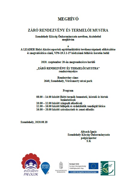 Szendehely Község Önkormányzata nevében, tisztelettel meghívom a A LEADER Helyi Akciócsoportok együttműködési tevékenységeinek előkészítése és megvalósítása című, VP6-19.3.1-17 kódszámú felhívás keretén belül 2020. szeptember 20-án megrendezésre kerülő „ZÁRÓ RENDEZVÉNY ÉS TERMELŐI MUSTRA” rendezvényekre