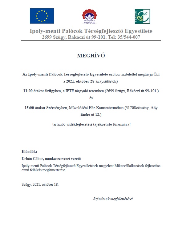 2021. október 28-án (csütörtök) 11:00 órakor Szügyben, a IPTE tárgyaló teremben (2699 Szügy, Rákóczi út 99-101.) és 15:00 órakor Szécsényben, Művelődési Ház Kamaratermében (3170Szécsény, Ady Endre út 12.)