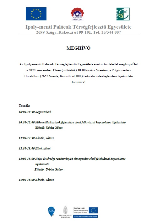 Az Ipoly-menti Palócok Térségfejlesztő Egyesülete ezúton tisztelettel meghívja Önt a 2022. november 17-én (csütörtök) 10:00 órakor Szentén, a Polgármesteri Hivatalban (2655 Szente, Kossuth út 100.) tartandó vidékfejlesztési tájékoztató fórumára!