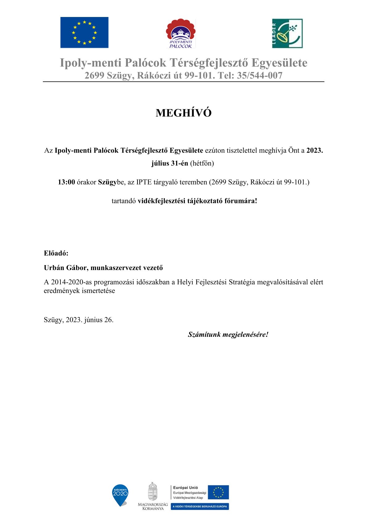 2023. július 31-én (hétfőn) 13:00 órakor Szügybe, az IPTE tárgyaló teremben (2699 Szügy, Rákóczi út 99-101.)