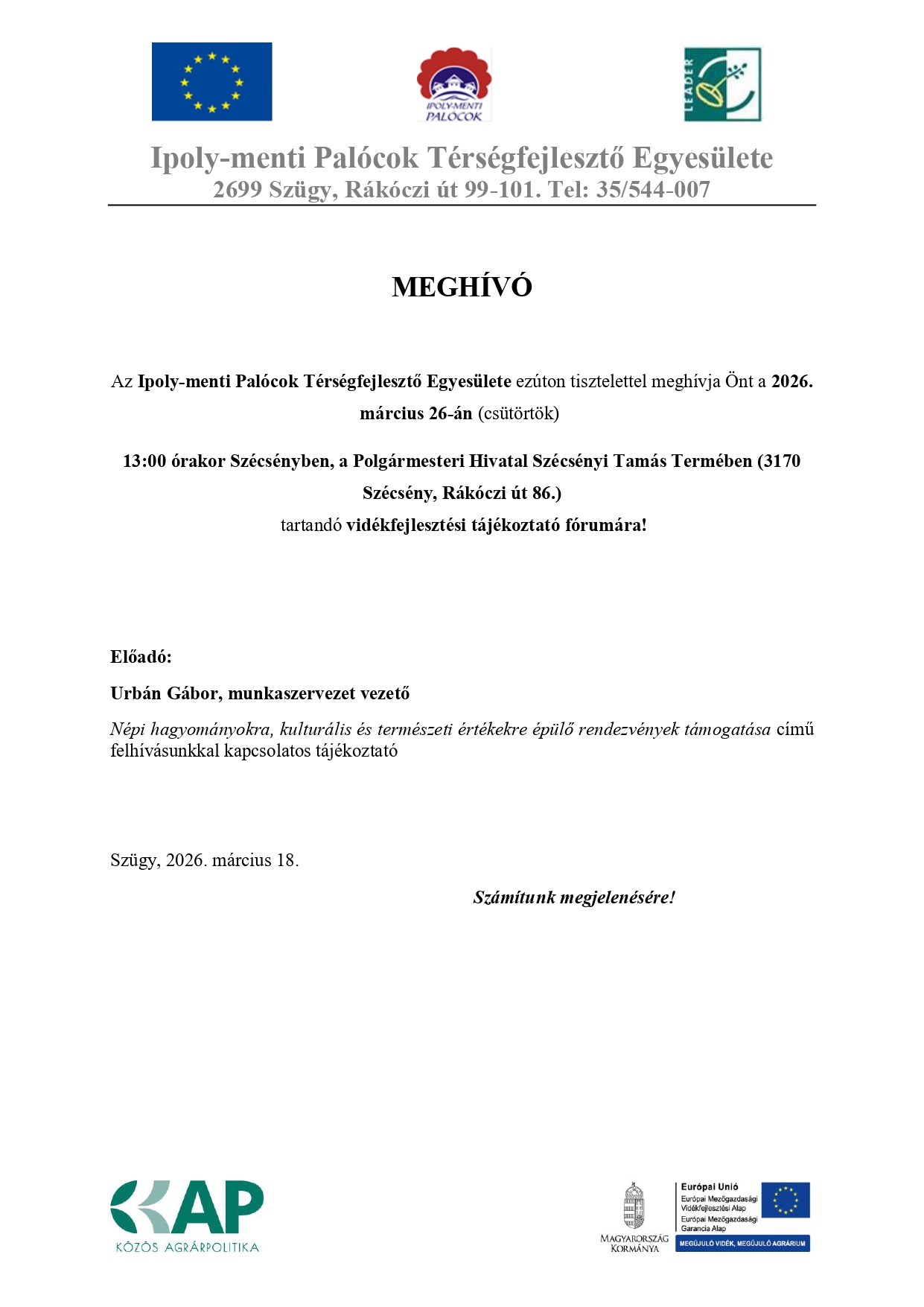 Az Ipoly-menti Palócok Térségfejlesztő Egyesülete ezúton tisztelettel meghívja Önt a 2026. március 26-án (csütörtök) 13:00 órakor Szécsényben, a Polgármesteri Hivatal Szécsényi Tamás Termében (3170 Szécsény, Rákóczi út 86.) tartandó vidékfejlesztési tájékoztató fórumára!